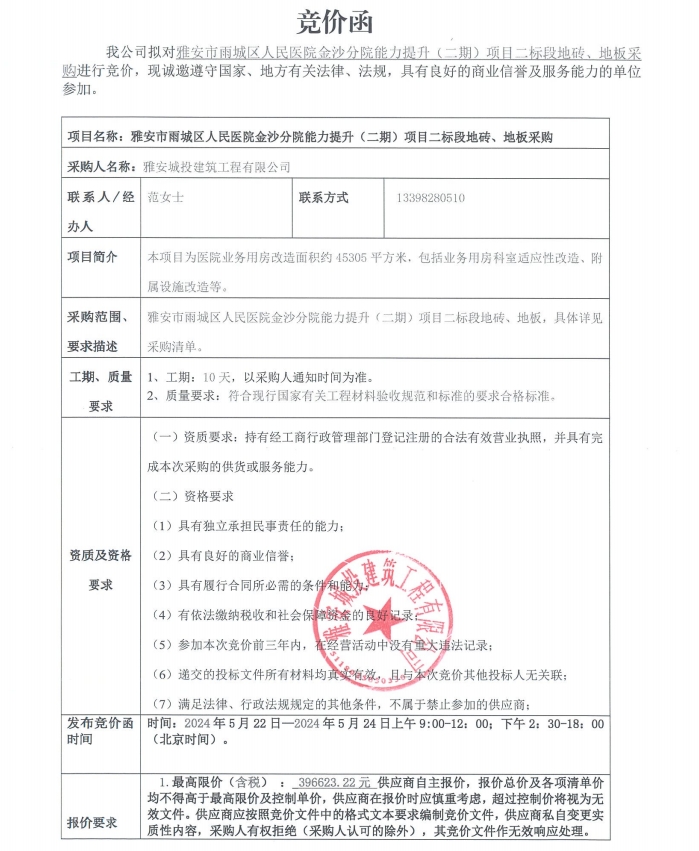 雅安市雨城區(qū)人民醫(yī)院金沙分院能力提升(二期)項目二標(biāo)段地磚、地板采購競價公告