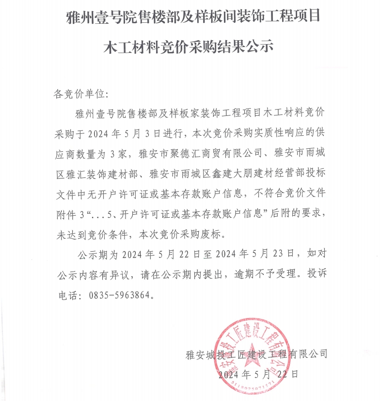 雅州壹號(hào)院售樓部及樣板間裝飾工程項(xiàng)目木工材料競(jìng)價(jià)采購(gòu)結(jié)果公示