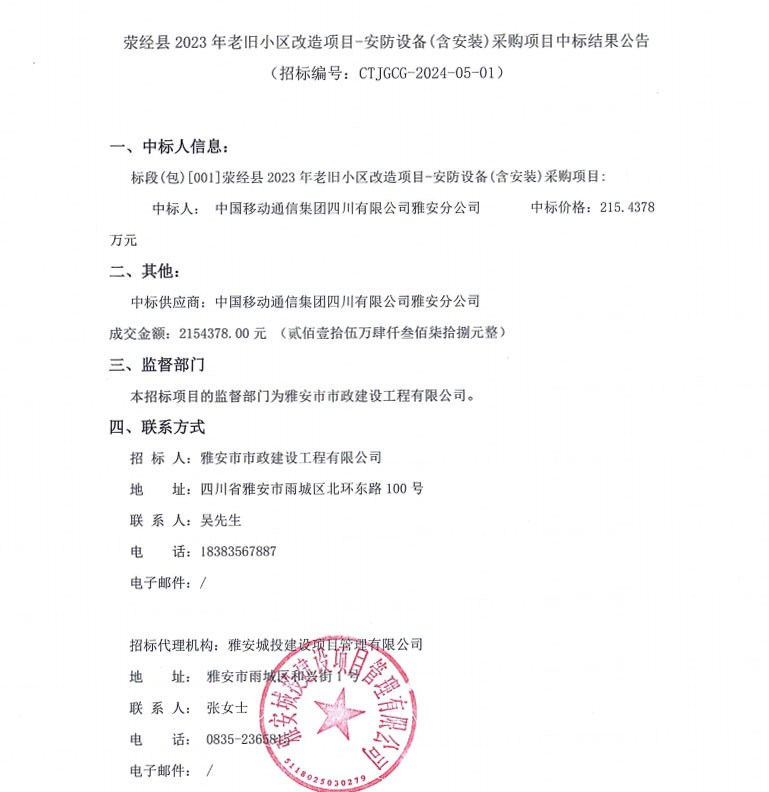 滎經(jīng)縣2023年老舊小區(qū)改造項目-安防設(shè)備(含安裝)采購項目中標結(jié)果公告