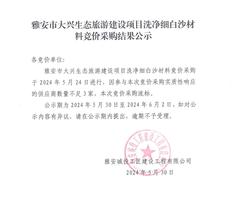 雅安市大興生態(tài)旅游建設(shè)項目洗凈細(xì)白沙材料競價采購結(jié)果公示