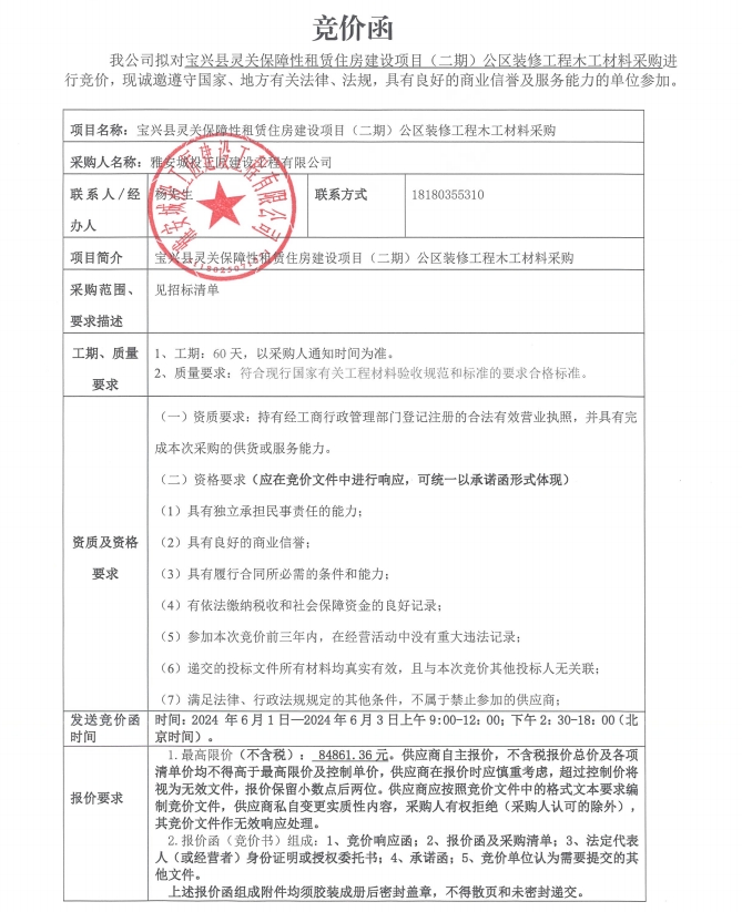 寶興縣靈關(guān)保障性租賃住房建設(shè)項目(二期)公區(qū)裝修工程木工材料采購競價公告