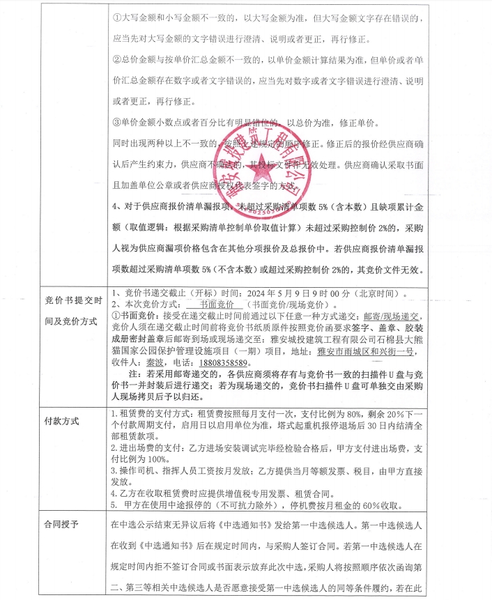 石棉縣大熊貓國家公園保護管理設施項目(一期)塔機租賃采購競價公告