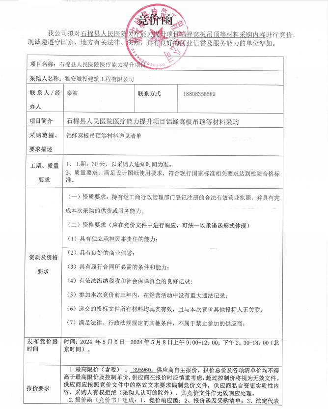 石棉縣人民醫(yī)院醫(yī)療能力提升項(xiàng)目鋁蜂窩板吊頂?shù)炔牧喜少?gòu)內(nèi)容競(jìng)價(jià)公告