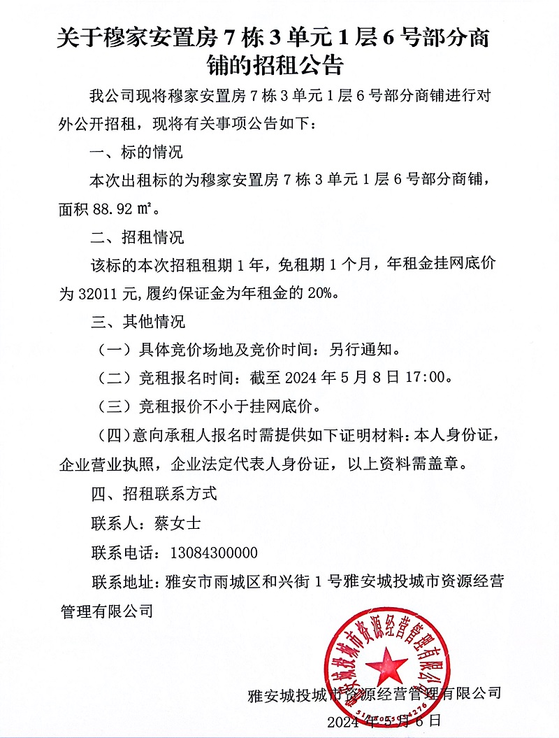 關(guān)于穆家安置房7棟3單元1層6號部分商鋪的招租公告
