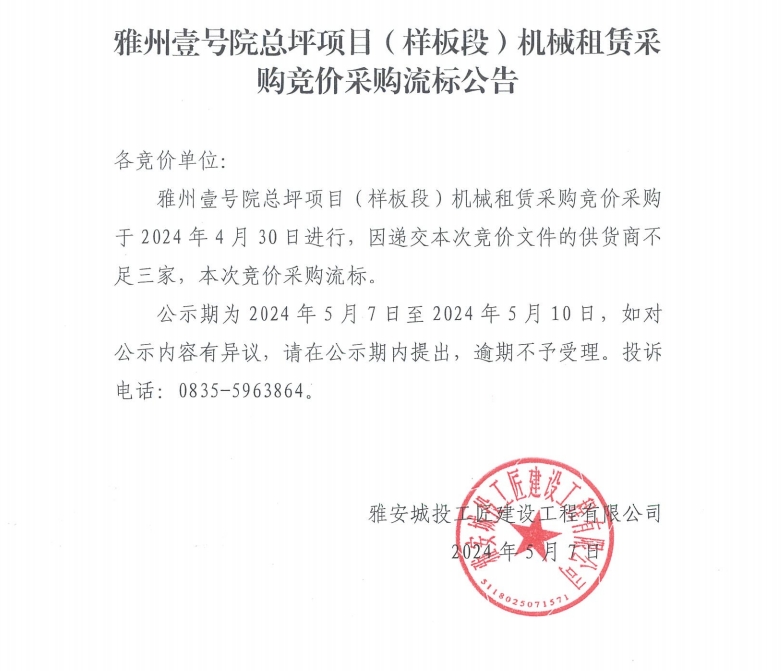 雅州壹號院總坪項目(樣板段)機械租賃采購競價采購流標公告
