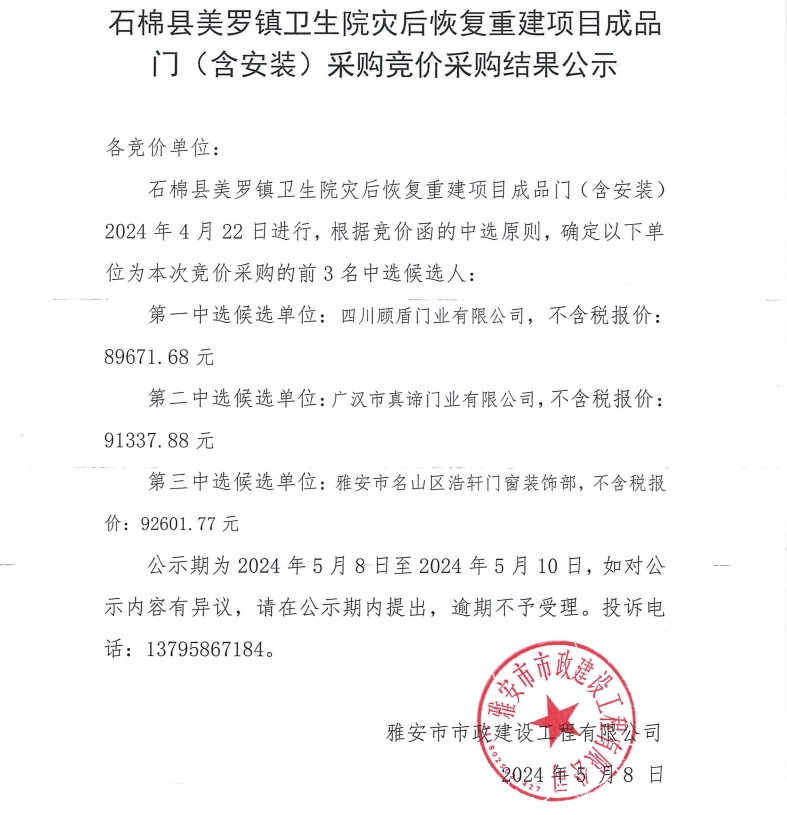 石棉縣美羅鎮(zhèn)衛(wèi)生院災(zāi)后恢復(fù)重建項目成品門(含安裝)采購競價采購結(jié)果公示