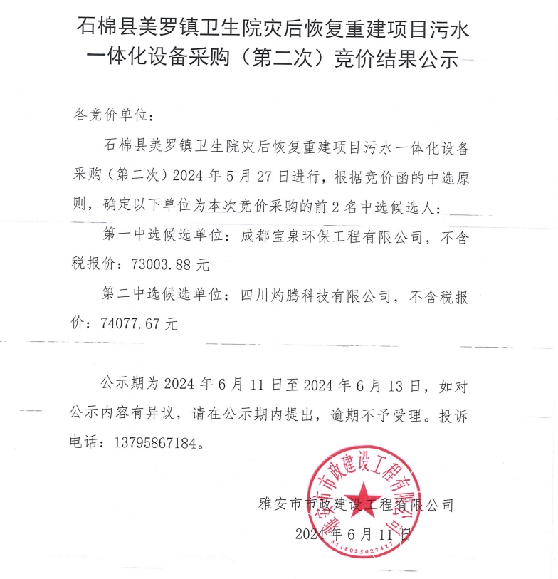 石棉縣美羅鎮(zhèn)衛(wèi)生院災(zāi)后恢復(fù)重建項(xiàng)目污水一體化設(shè)備材料采購(gòu)(第二次)競(jìng)價(jià)結(jié)果公示