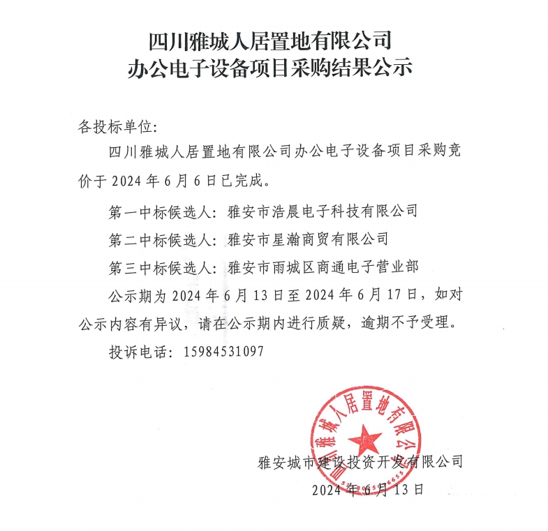 四川雅城人居置地有限公司辦公電子設備項目采購結(jié)果公示