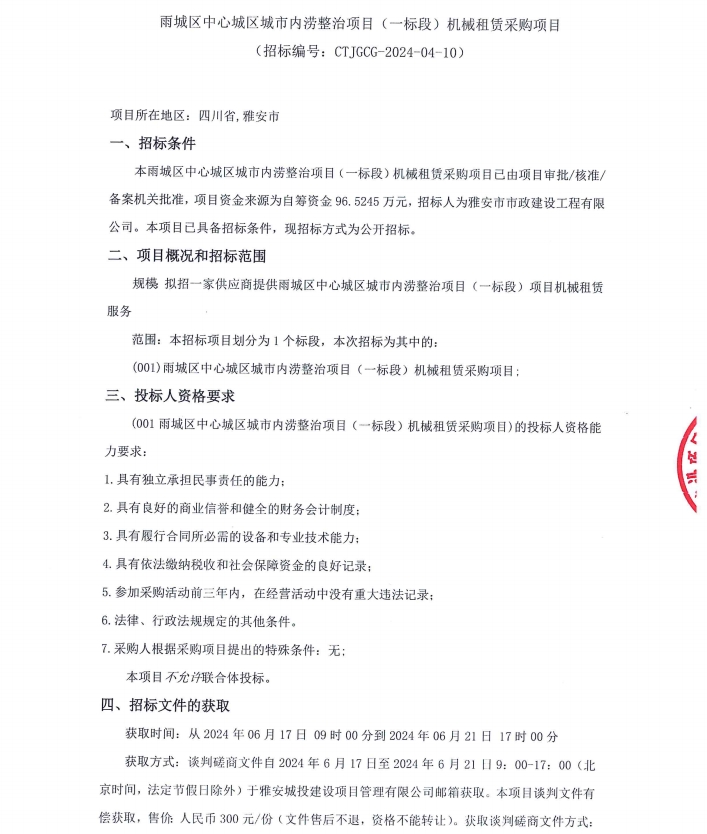 雨城區(qū)中心城區(qū)城市內(nèi)澇整治項目(一標(biāo)段)項目機械租賃采購項目招標(biāo)公告