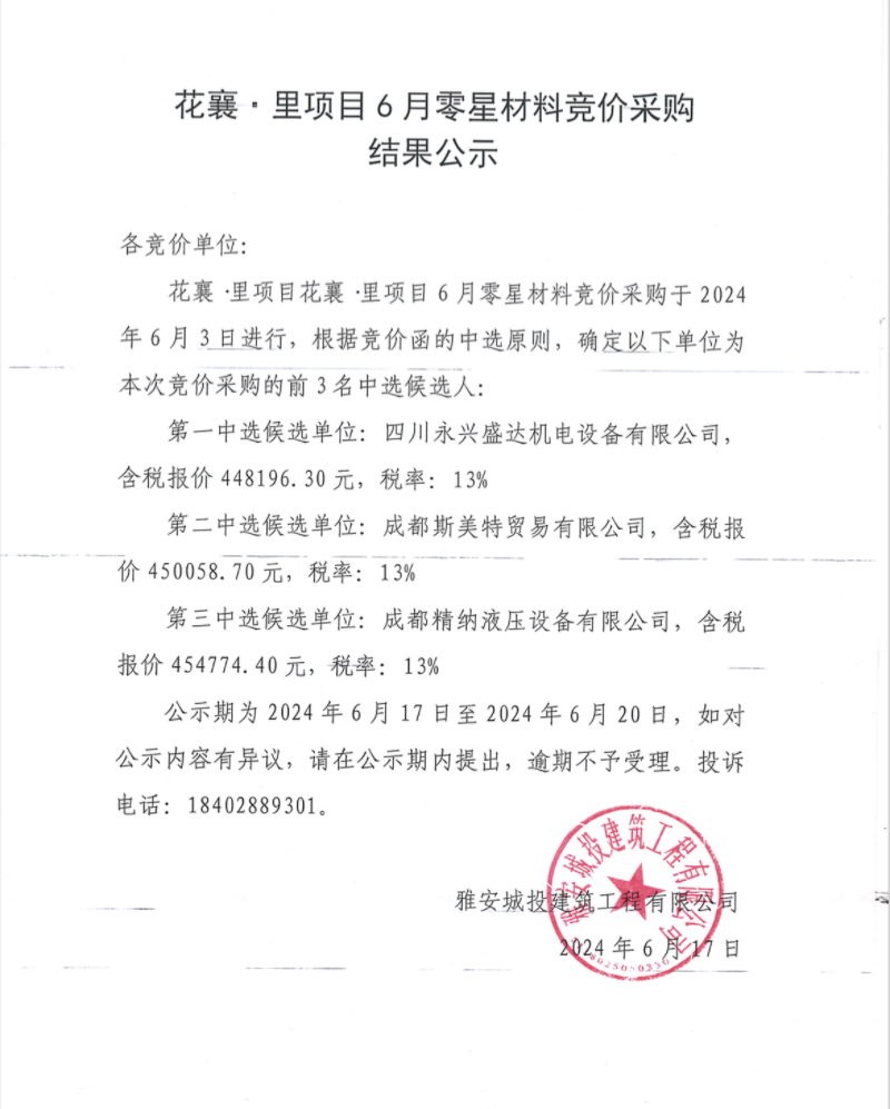花襄·里項(xiàng)目6月零星材料競(jìng)價(jià)采購(gòu)結(jié)果公示