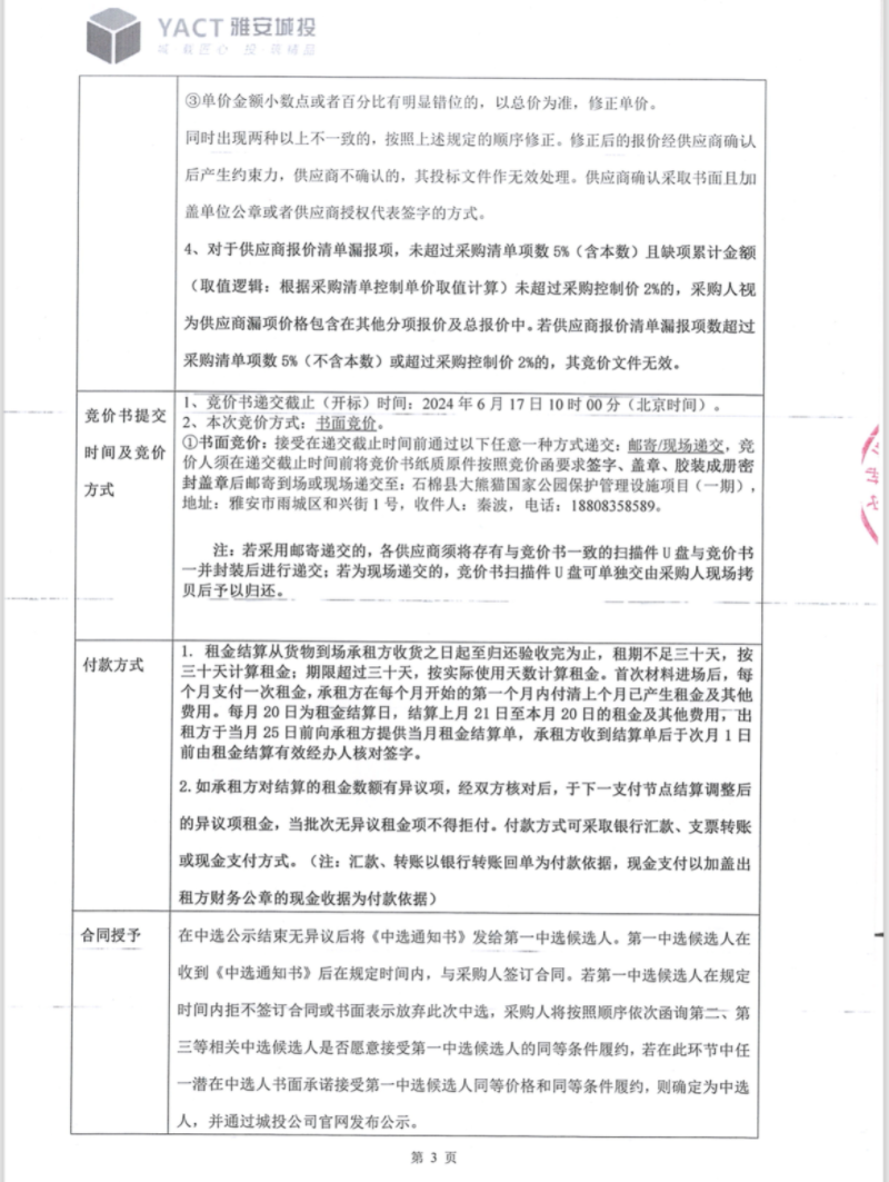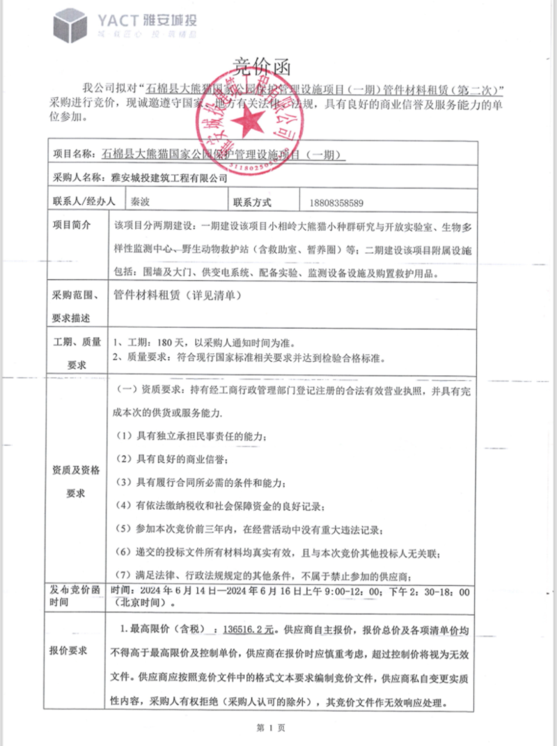 石棉縣大熊貓國家公園保護管理設(shè)施項目(一期)管件材料租賃(第二次)競價公告