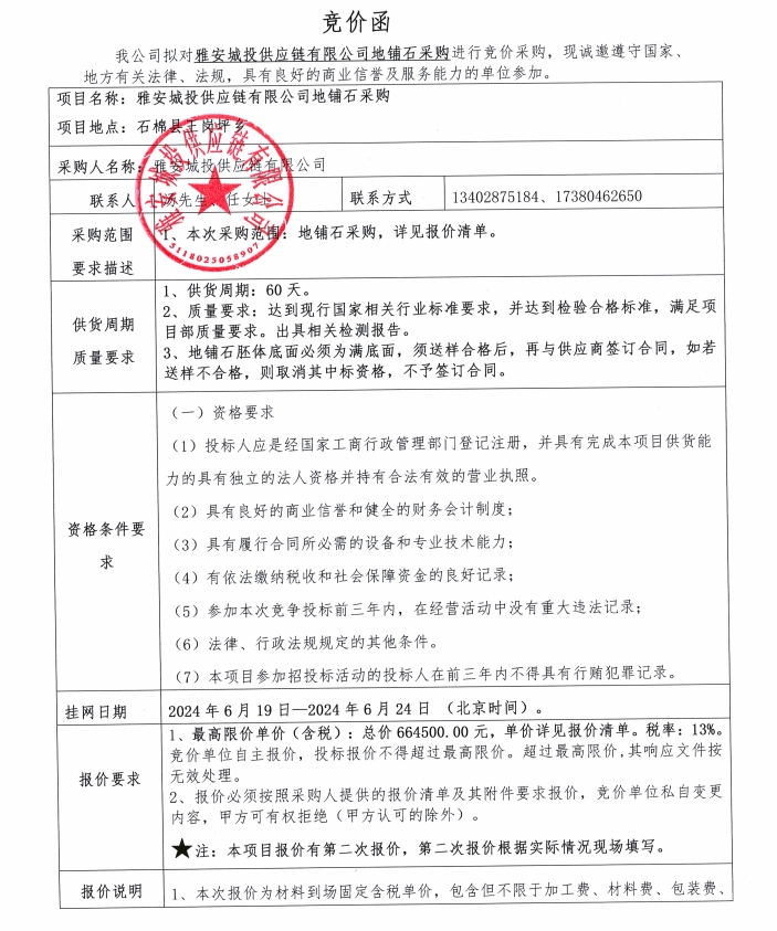 雅安城投供應(yīng)鏈有限公司地鋪石采購競(jìng)價(jià)公告