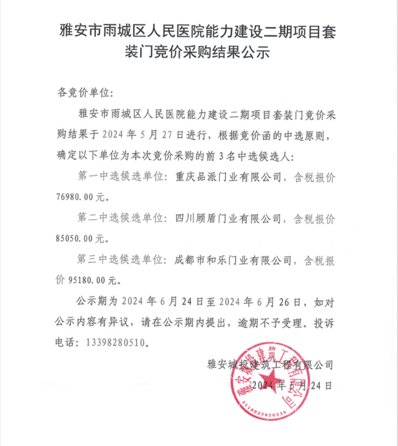 雅安市雨城區(qū)人民醫(yī)院能力建設(shè)二期項(xiàng)目套裝門競(jìng)價(jià)采購(gòu)結(jié)果公示