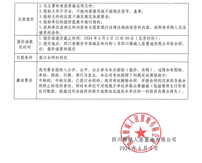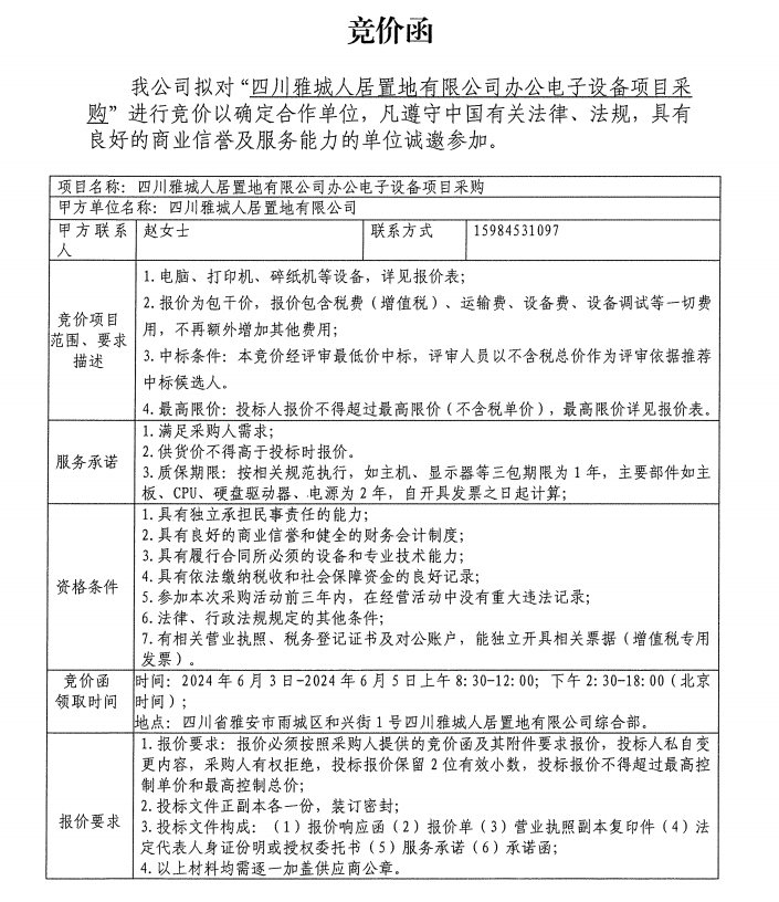 四川雅城人居置地有限公司辦公電子設備項目采購競價公告