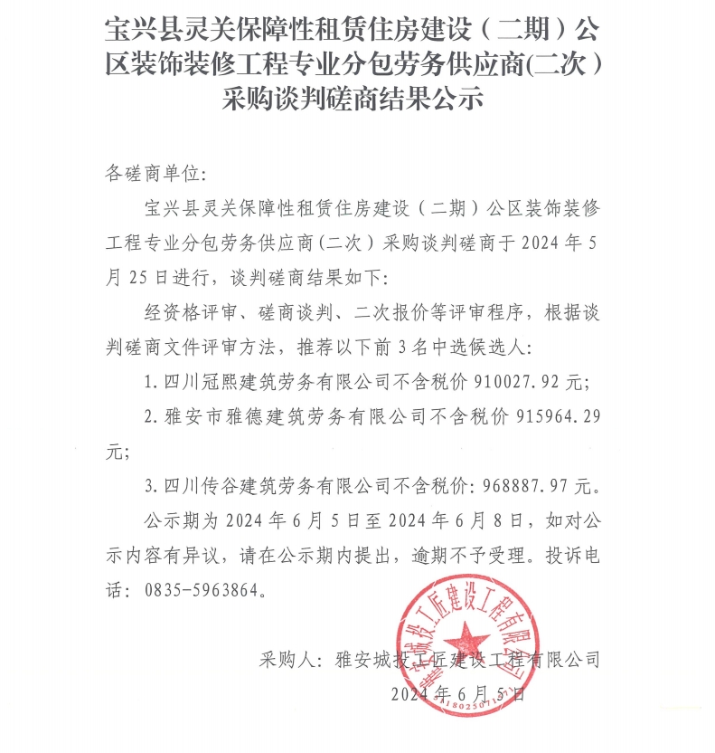 寶興縣靈關(guān)保障性租賃住房建設(shè)(二期)公區(qū)裝飾裝修工程專(zhuān)業(yè)分包勞務(wù)供應(yīng)商(二次)采購(gòu)談判磋商結(jié)果公示