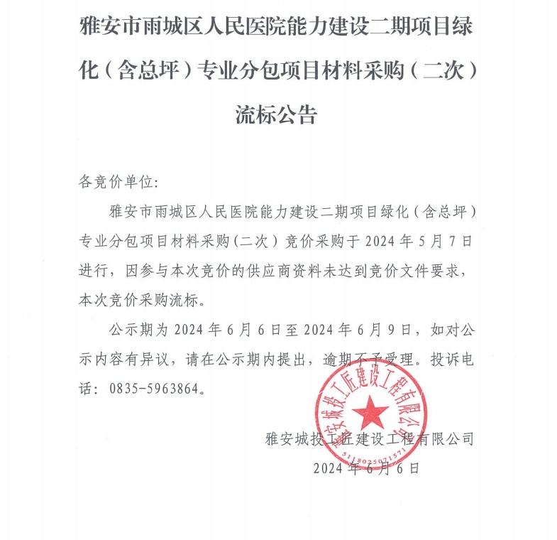 雅安市雨城區(qū)人民醫(yī)院能力建設(shè)二期項(xiàng)目綠化(含總坪)專業(yè)分包材料采購(gòu)(二次)流標(biāo)公告