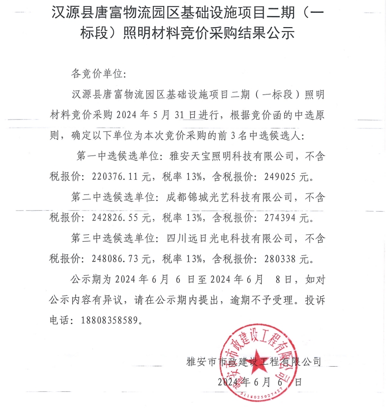 漢源縣唐富物流園區(qū)基礎(chǔ)設(shè)施項目二期(一標(biāo)段)照明材料競價采購結(jié)果公示