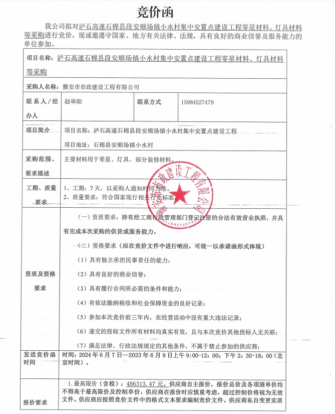瀘石高速石棉縣段安順場鎮(zhèn)小水村集中安置點(diǎn)建設(shè)工程零星材料、燈具材料等采購競價(jià)公告