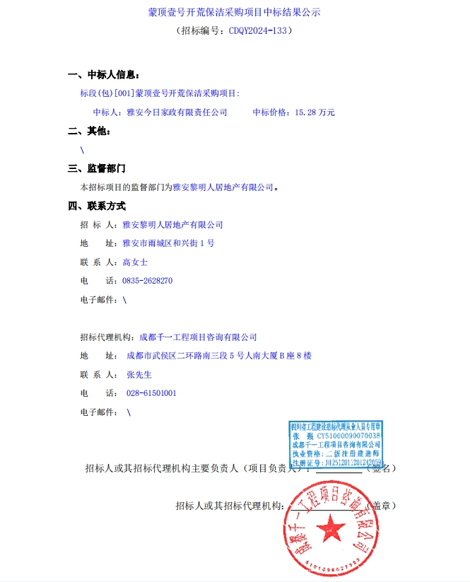 蒙頂壹號(hào)開荒保潔采購項(xiàng)目中標(biāo)結(jié)果公示