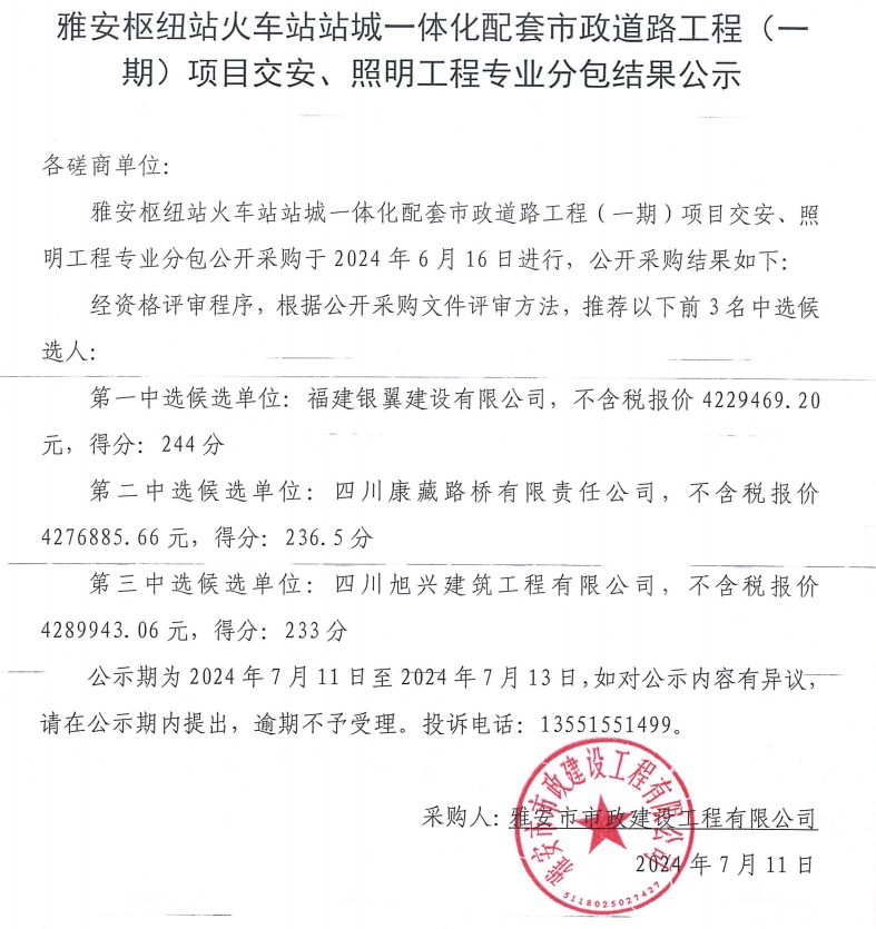 雅安樞紐站火車站站城一體化配套市政道路工程(一期)項目交安、照明工程專業(yè)分包結果公示