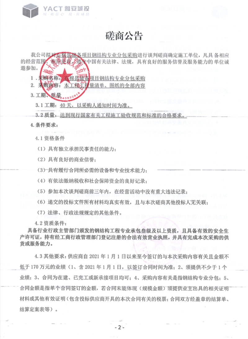 石棉縣儲(chǔ)備項(xiàng)目鋼結(jié)構(gòu)專業(yè)分包采購(gòu)談判磋商公告
