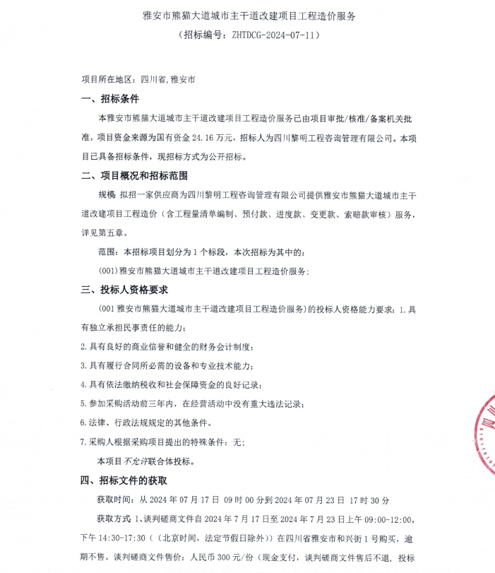 雅安市熊貓大道城市主干道改建項目工程造價服務(wù)公告