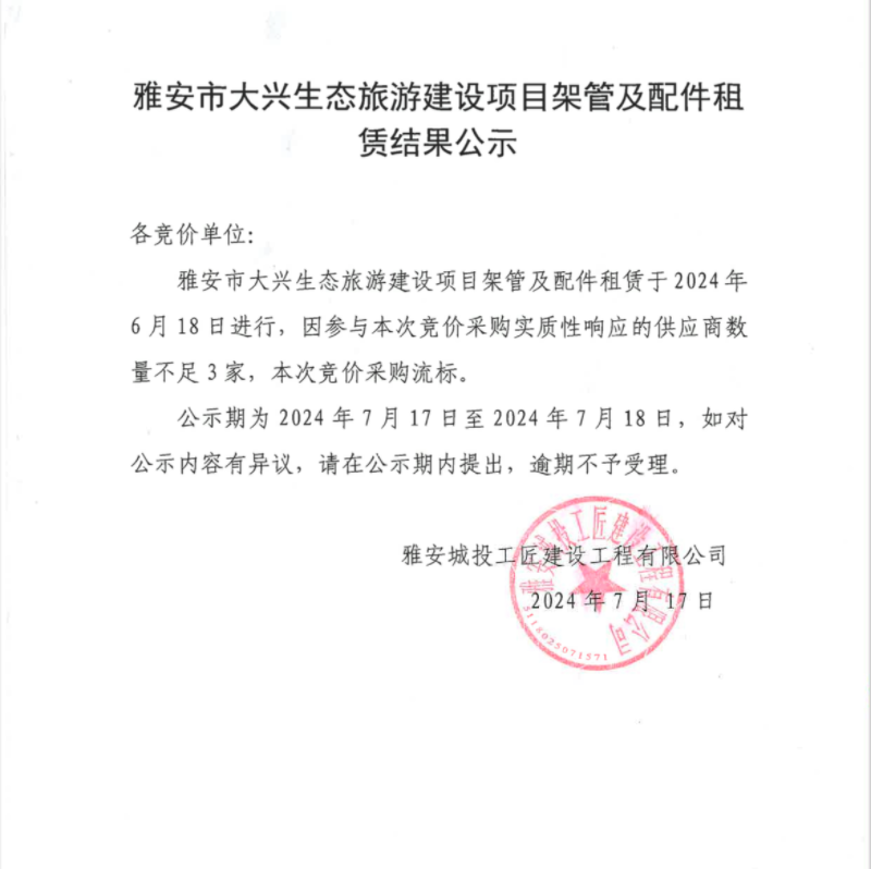 雅安市大興生態(tài)旅游建設(shè)項目架管及配件租賃結(jié)果公示