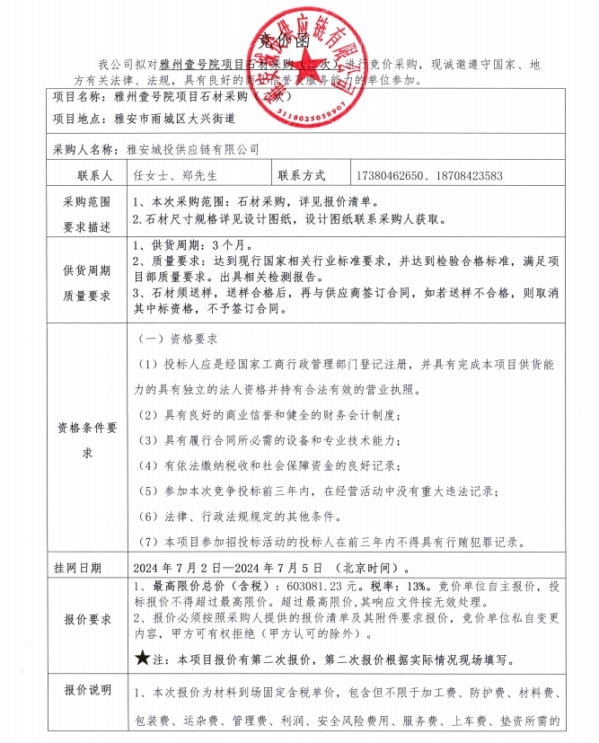 雅州壹號院項目石材采購(二次)競價公告