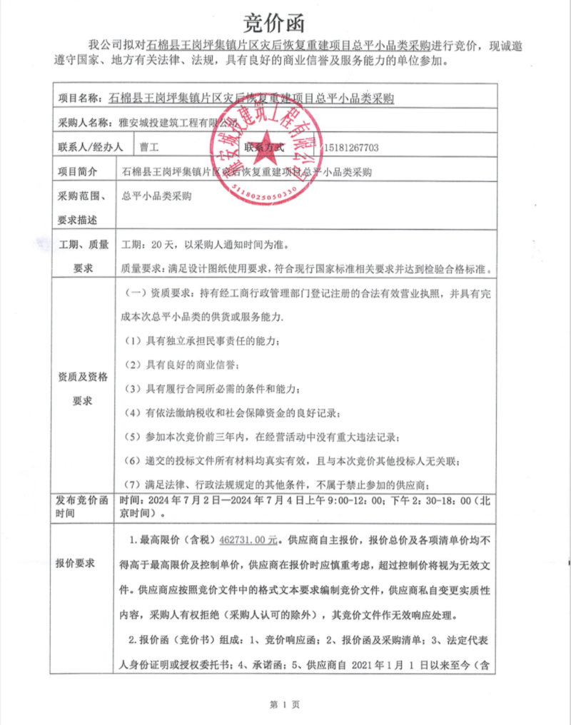 石棉縣王崗坪集鎮(zhèn)片區(qū)災后恢復重建項目總平小品類采購競價公告