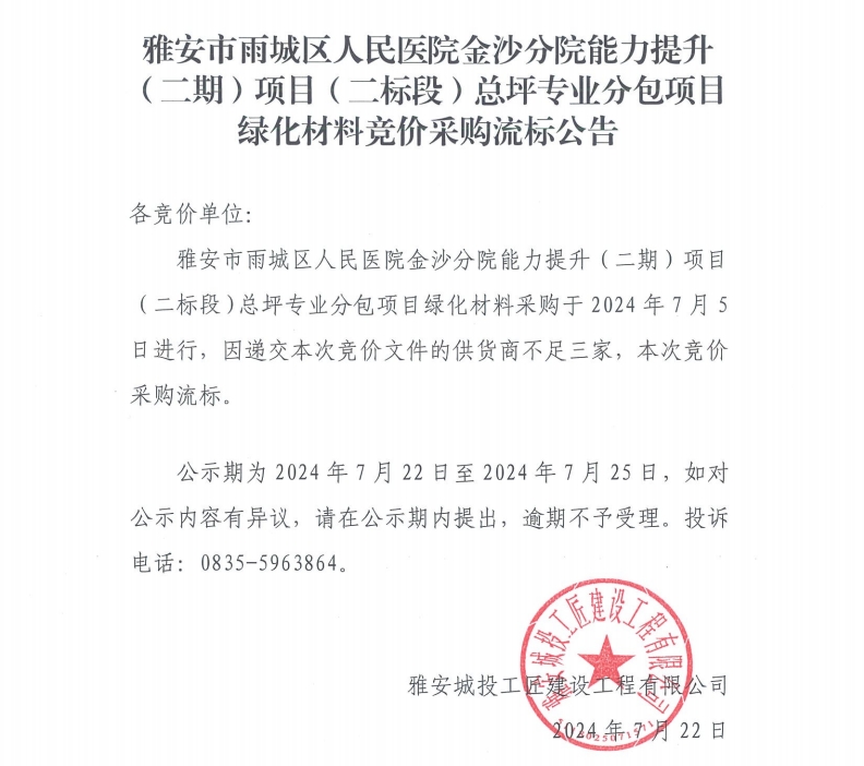 雅安市雨城區(qū)人民醫(yī)院金沙分院能力提升(二期)項(xiàng)目(二標(biāo)段)總坪專業(yè)分包項(xiàng)目綠化材料競價采購流標(biāo)公告