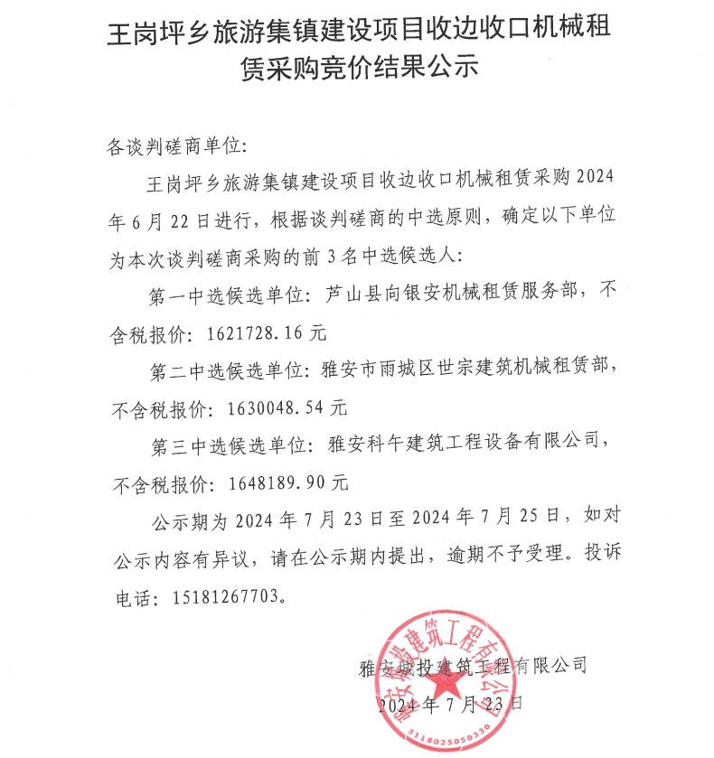 王崗坪鄉(xiāng)旅游集鎮(zhèn)建設(shè)項目收邊收口機械租賃采購競價結(jié)果公示