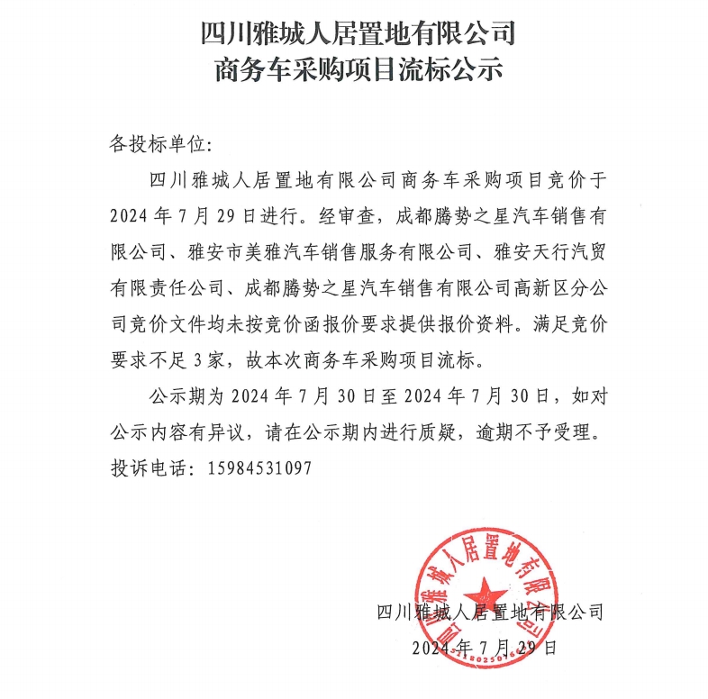 四川雅城人居置地有限公司商務(wù)車采購項(xiàng)目流標(biāo)公示