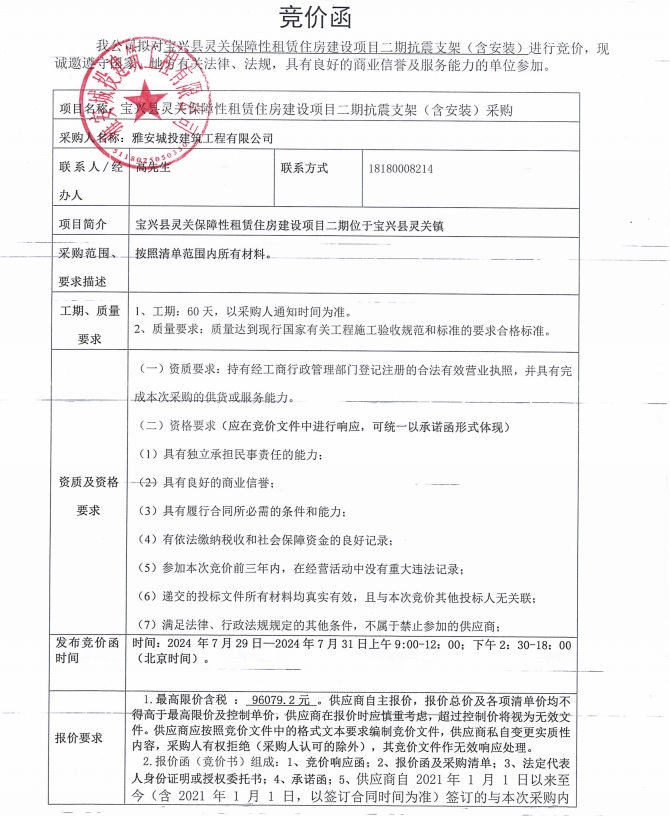 寶興縣靈關(guān)保障性租賃住房建設(shè)項(xiàng)目二期抗震支架(含安裝)采購競價(jià)公告