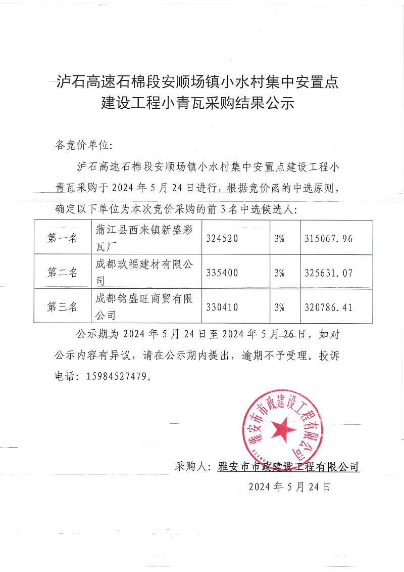 瀘石高速石棉縣段安順場鎮(zhèn)小水村集中安置點建設工程小青瓦采購結果公示