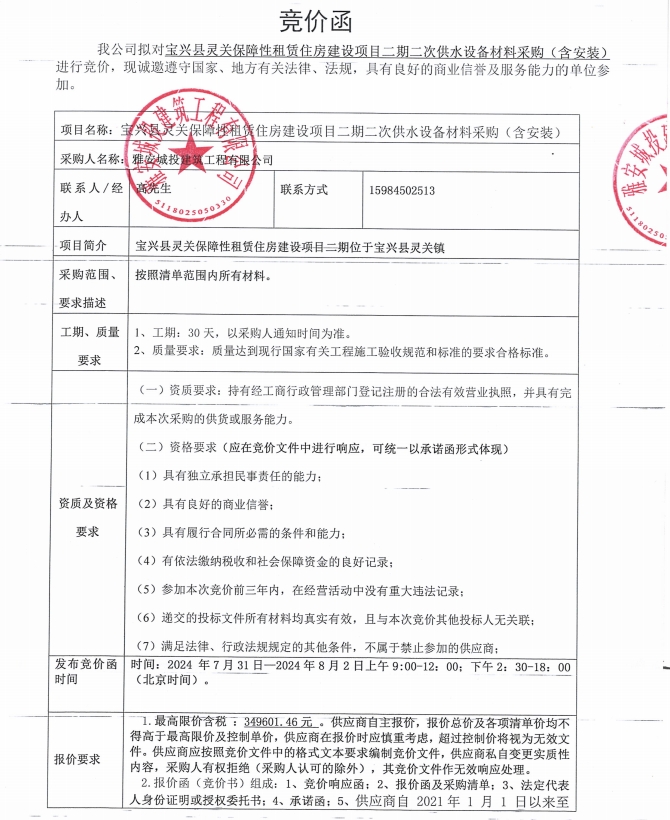 寶興縣靈關(guān)保障性租賃住房建設(shè)項(xiàng)目二期二次供水設(shè)備采購(含安裝)競(jìng)價(jià)公告