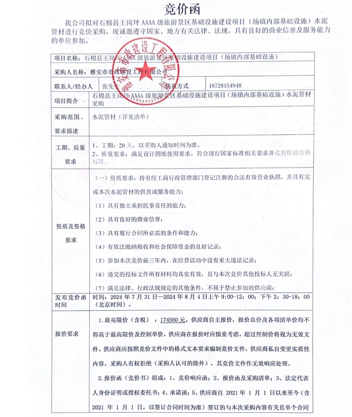 石棉縣王崗坪AAAA級旅游景區(qū)基礎(chǔ)設(shè)施建設(shè)項(xiàng)目(場鎮(zhèn)內(nèi)部基礎(chǔ)設(shè)施)水泥管材采購競價(jià)公告