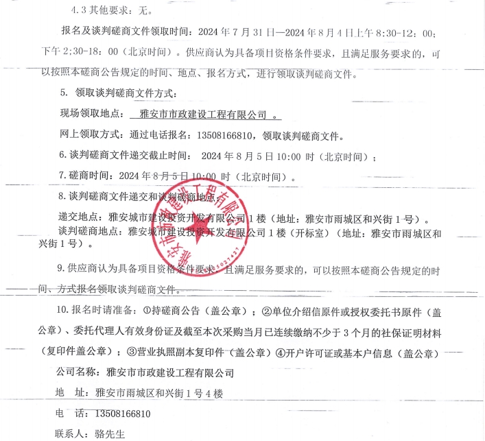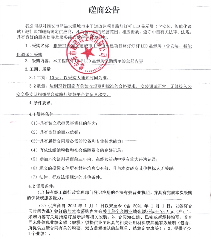 雅安市熊貓大道城市主干道改建項(xiàng)目路燈燈桿LED顯示屏(含安裝、智能化調(diào)試)磋商公告