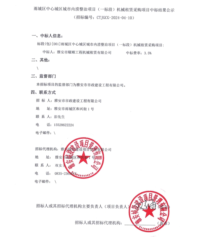 雨城區(qū)中心城區(qū)城市內(nèi)澇整治項目(一標段)機械租賃采購項目中標結果公示