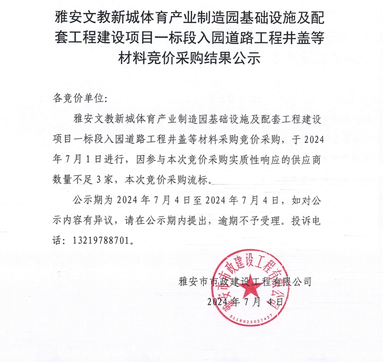 雅安文教新城體育產(chǎn)業(yè)制造園基礎(chǔ)設(shè)施及配套工程建設(shè)項目一標段入園道路工程井蓋等材料競價采購結(jié)果公示