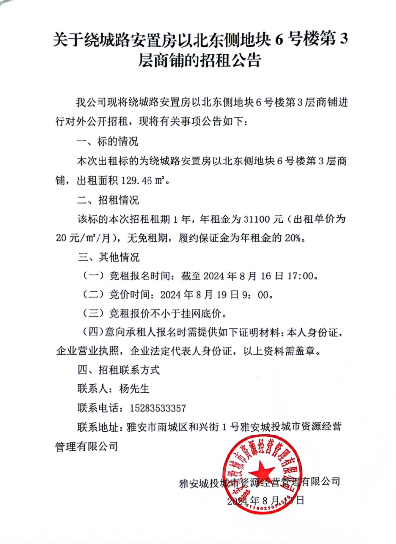 關于繞城路安置房以北東側地塊6號樓第3層商鋪的招租公告