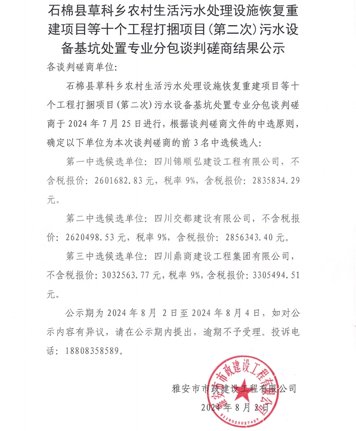 石棉縣草科鄉(xiāng)農(nóng)村生活污水處理設(shè)施恢復重建項目等十個工程打捆項目(第二次) 污水設(shè)備基坑處置專業(yè)分包談判磋商結(jié)果公示