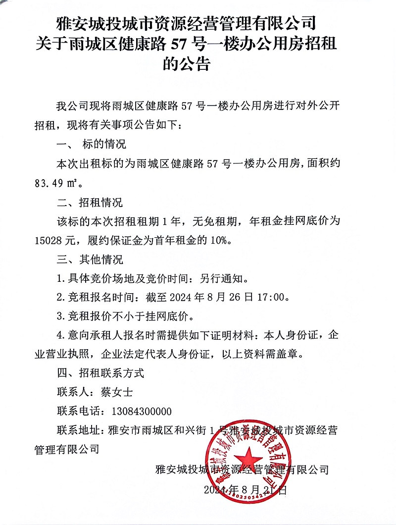 雅安城投城市資源經(jīng)營(yíng)管理有限公司關(guān)于雨城區(qū)健康路75號(hào)一樓辦公用房招租的公告