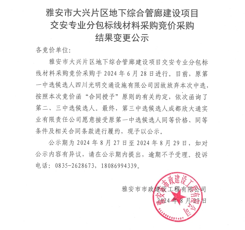 雅安市大興片區(qū)地下綜合管廊建設(shè)項(xiàng)目交安專業(yè)分包標(biāo)線材料采購競價(jià)采購結(jié)果變更公示