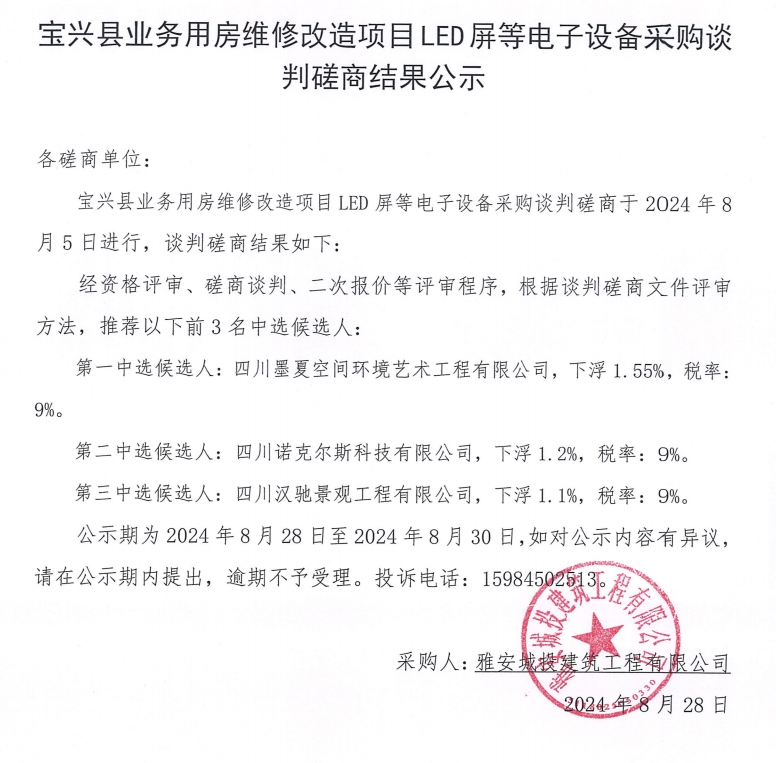 寶興縣業(yè)務(wù)用房維修改造項(xiàng)目LED屏等電子設(shè)備采購磋商結(jié)果公示