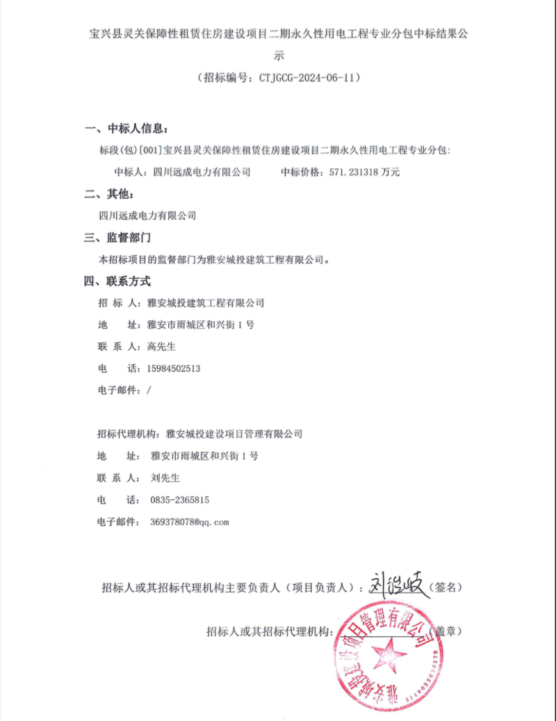 寶興縣靈關(guān)保障性租賃住房建設(shè)項(xiàng)目二期永久性用電工程專業(yè)分包中標(biāo)結(jié)果公示