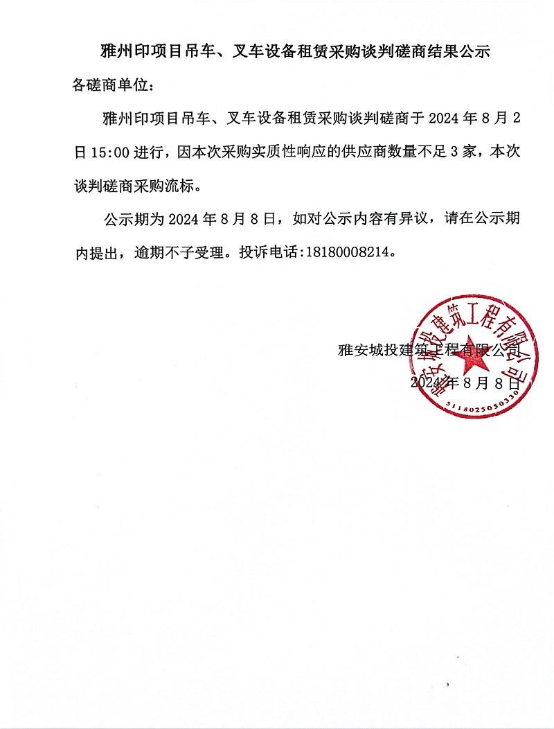 雅州印項目吊車、叉車設(shè)備租賃采購談判磋商結(jié)果公示