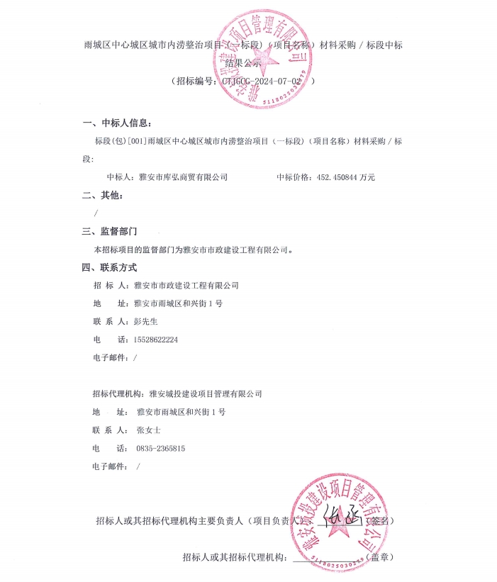 雨城區(qū)中心城區(qū)城市內(nèi)澇整治項目(一標段)(項目名稱)材料采購/標段中標結(jié)果公示