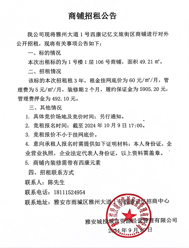 雅州大道1號(hào)西康記憶文旅街區(qū)商鋪招租公告