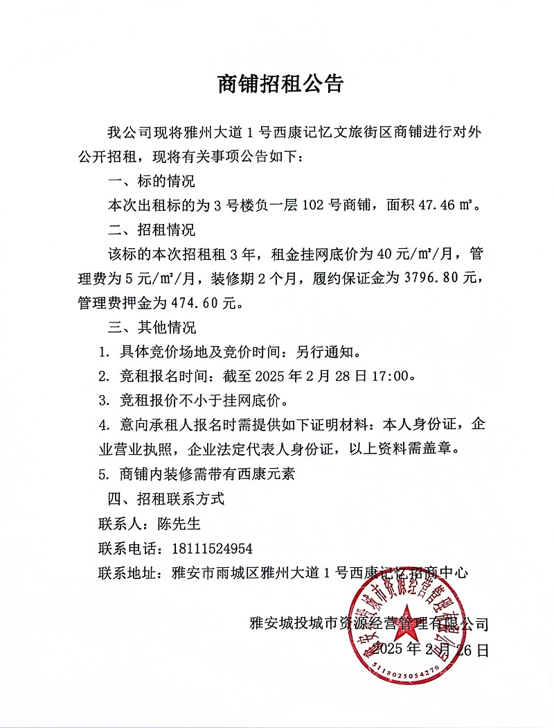關(guān)于雅州大道1號(hào)西康記憶文旅街區(qū)3號(hào)樓負(fù)一層102號(hào)商鋪招租公告