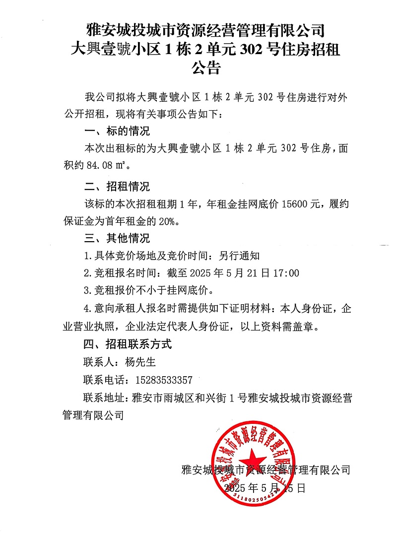 雅安城投資源經(jīng)營管理有限公司大興壹號小區(qū)1棟2單元302號住房招租公告